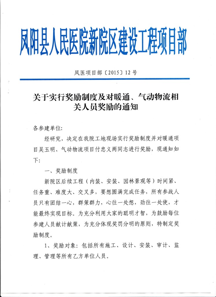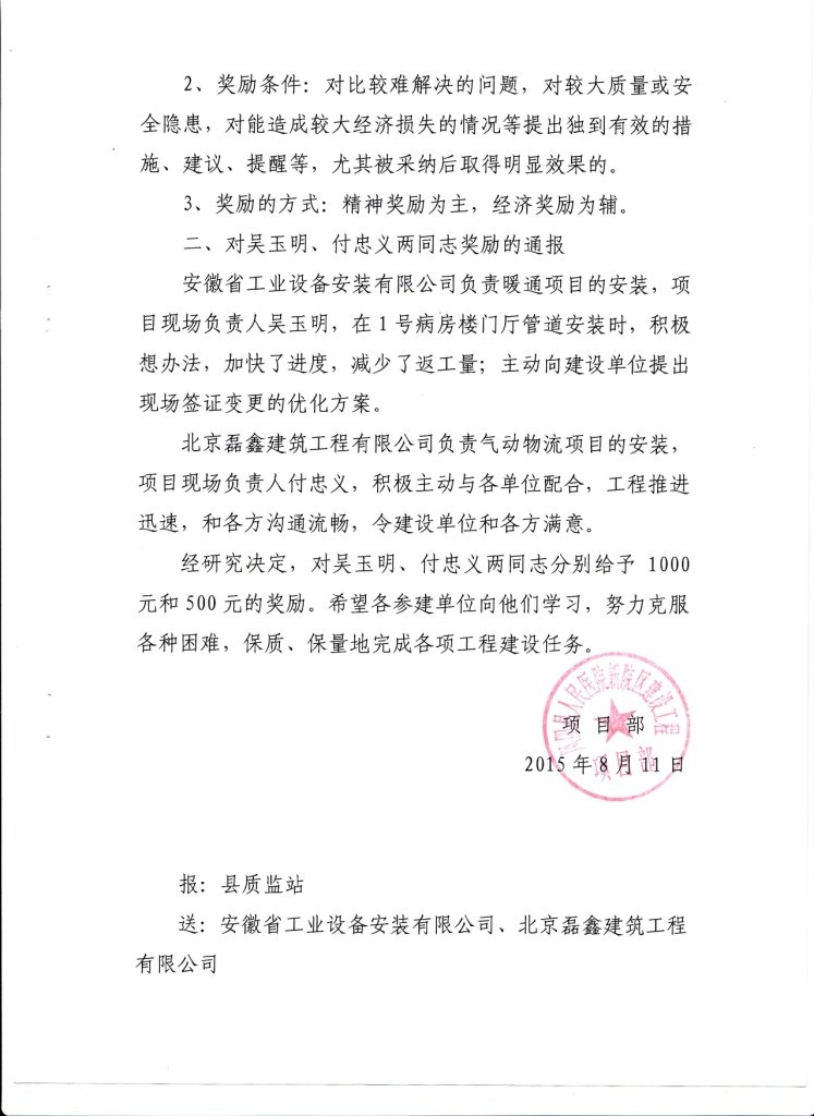 8月11日,鳳陽縣人民醫院新院區建設工程項目部發來賀文,就公司第九分公司承攬的鳳陽縣人民醫院新院區暖通項目安裝工程表示肯定,并對該項目的現場負責人吳玉明同志給予表彰和獎勵通報。