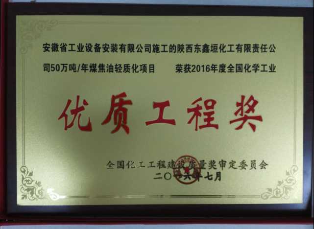 近日,從全國化學(xué)工程建設(shè)質(zhì)獎審定委員會傳來喜訊,公司參建的陜西東鑫垣化工有限責(zé)任公司50萬噸/年煤焦油輕質(zhì)化項目榮獲“2016年度全國化學(xué)工業(yè)優(yōu)質(zhì)工程獎”。