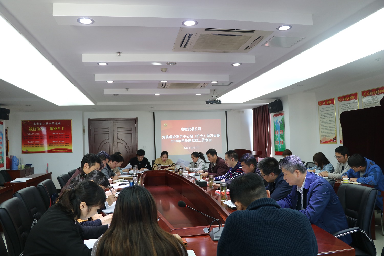 10月27日上午,安徽安裝公司召開2018年四季度黨群工作例會。會議由公司黨委書記、董事長胡六中主持。所屬各基層黨支部、工會、團支部主要負責(zé)同志及公司黨群部門人員參加了會議。