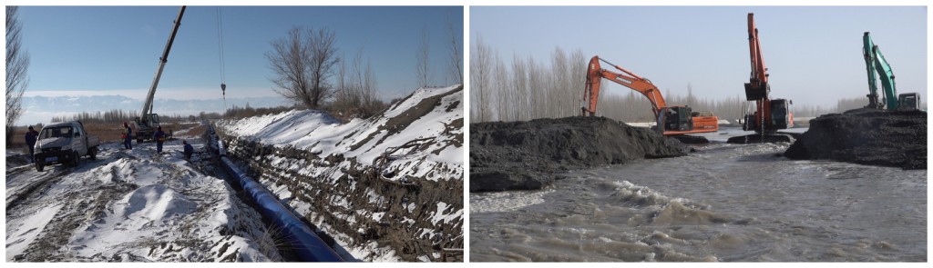 由于施工工期短,為了按時(shí)完成管道穿引洪渠任務(wù),目前,在項(xiàng)目執(zhí)行經(jīng)理柴琳、項(xiàng)目副經(jīng)理張寶深以及項(xiàng)目技術(shù)負(fù)責(zé)人蔡京利的帶領(lǐng)下,項(xiàng)目部正在堅(jiān)持24小時(shí)不間斷施工;除此之外,由于施工現(xiàn)場(chǎng)“戰(zhàn)線長”,距離附近集鎮(zhèn)和項(xiàng)目部基地都較遠(yuǎn),項(xiàng)目部在河渠邊搭建兩個(gè)軍用帳篷做為施工指揮部,“冷饃硬馕加泡面”成了項(xiàng)目部午餐“標(biāo)配”。施工間歇,施工人員就在管溝邊用撿到的枯木點(diǎn)燃火堆取暖。在穿越四棵樹河施工段施工過程中,管溝挖深總共約4米,但管溝中的水深卻高達(dá)3米,由于管道安裝滿足標(biāo)高要求,即使面臨開挖出水多,施工難度大的困境,項(xiàng)目副經(jīng)理馬讓同志依舊毫不猶豫地召集起項(xiàng)目上的黨員同志,帶頭穿上雨衣皮褲,站在挖機(jī)斗中下河扶塔尺測(cè)標(biāo)高,保證管道安裝質(zhì)量。他們的身影深深地感染著項(xiàng)目上的每一個(gè)人。在四棵樹河中管道施工時(shí),需要將上游河水截流,時(shí)間緊任務(wù)重,項(xiàng)目全體員工不喊累不叫苦,沒日沒夜加班奮戰(zhàn),搶抓施工進(jìn)度......