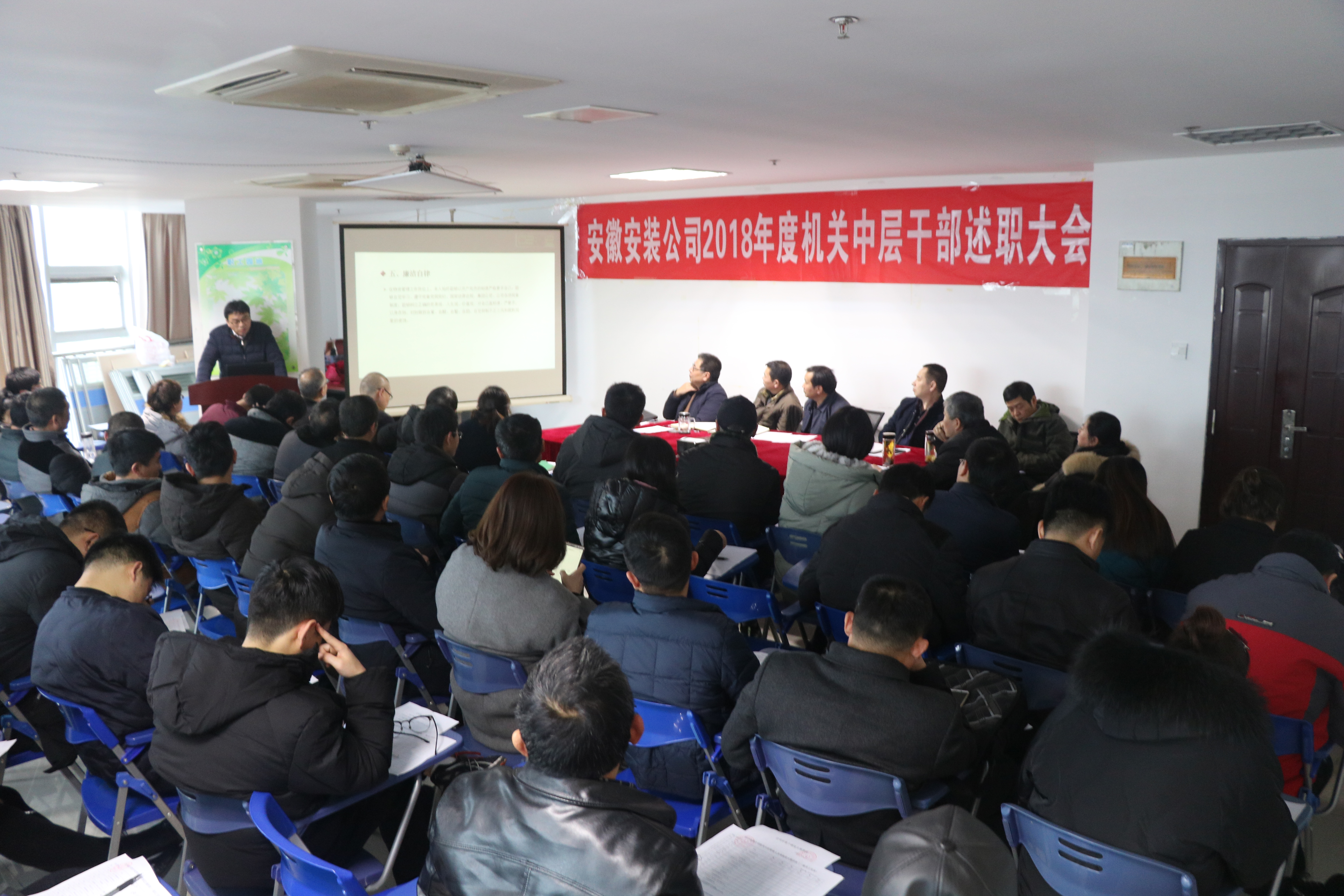1月11日下午,安徽安裝公司召開2018年度機(jī)關(guān)中層干部述職述廉大會。公司領(lǐng)導(dǎo)班子成員、機(jī)關(guān)中層干部、分公司黨政主要領(lǐng)導(dǎo)、機(jī)關(guān)全體員工共80余人參加了此次會議。大會由公司黨委書記、董事長胡六中主持。