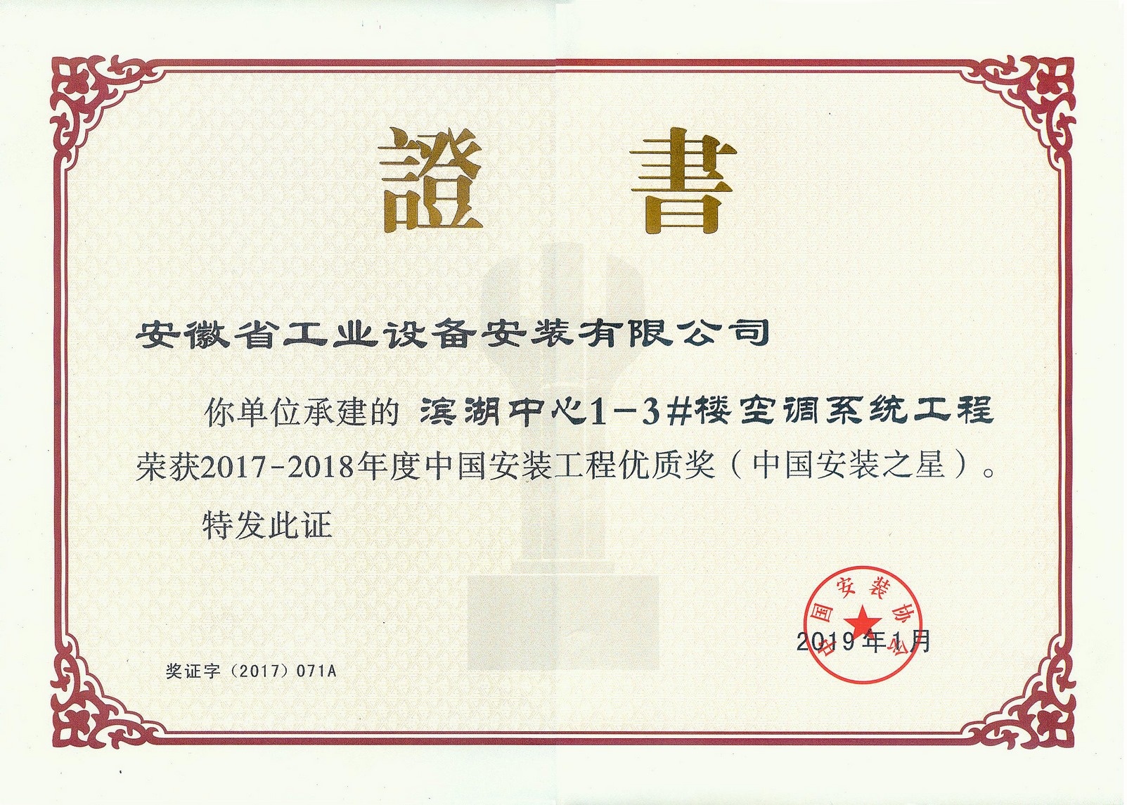 會上宣讀并表彰了2017-2018年度中國安裝工程優質獎(中國安裝之星),我公司承建的“濱湖中心1-3#樓空調系統工程”項目榮獲該項榮譽。