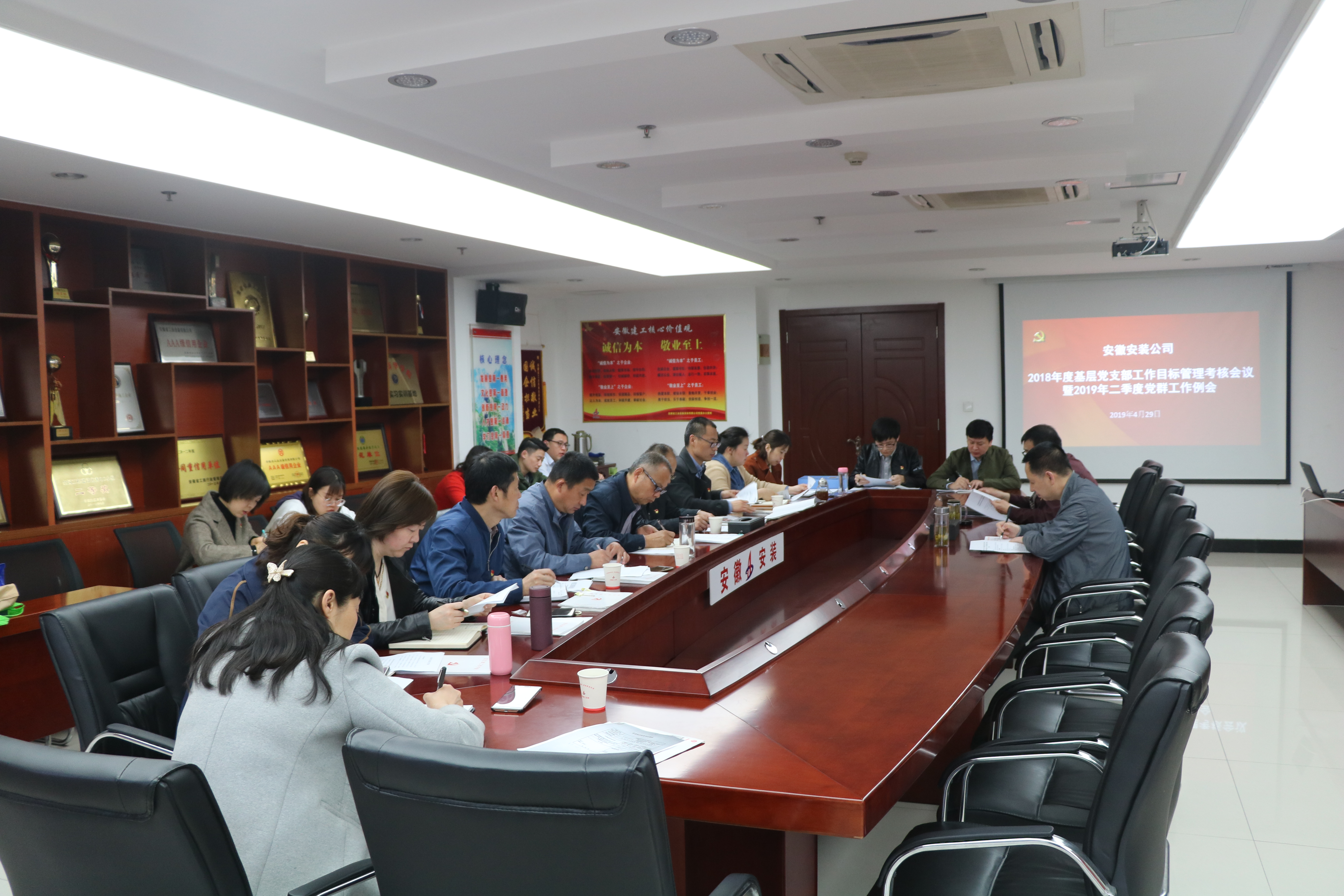 4月29日上午,安徽安裝召開2018年度基層黨支部工作目標管理考核會議。會議由公司紀委書記、工會主席李寬旭主持。公司黨委書記、董事長胡六中出席會議,所屬各基層黨支部書記、工會主席、團支部書記及公司黨群部門人員參加了會議。