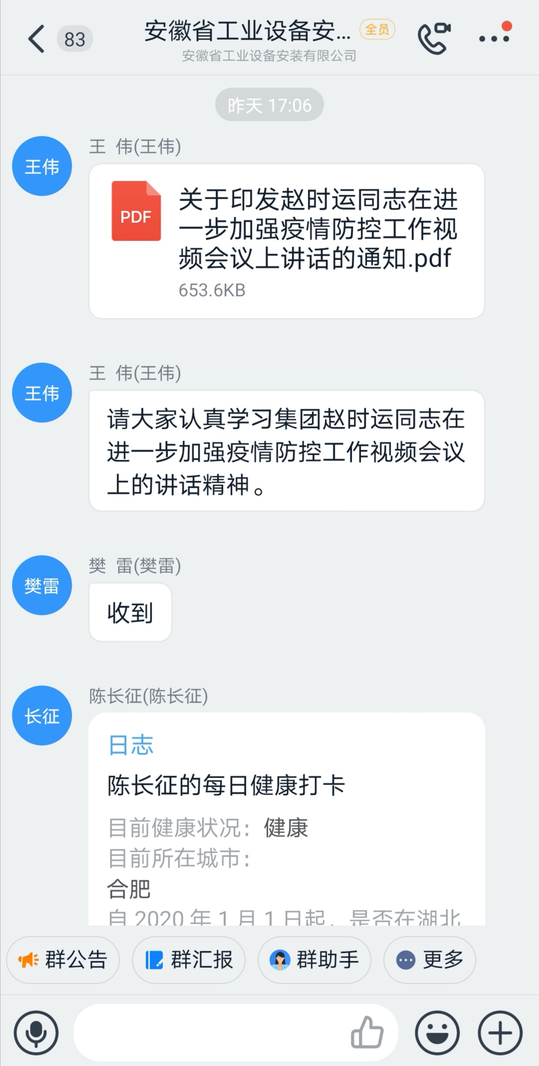 2月11日,安徽安裝公司通過釘釘日志、疫情防控群等網(wǎng)絡形式,迅速將《集團公司黨委書記、董事長趙時運在進一步加強疫情防控工作視頻會議上的講話》精神,傳達到每名職工,做到人人皆知,認真加以貫徹落實。