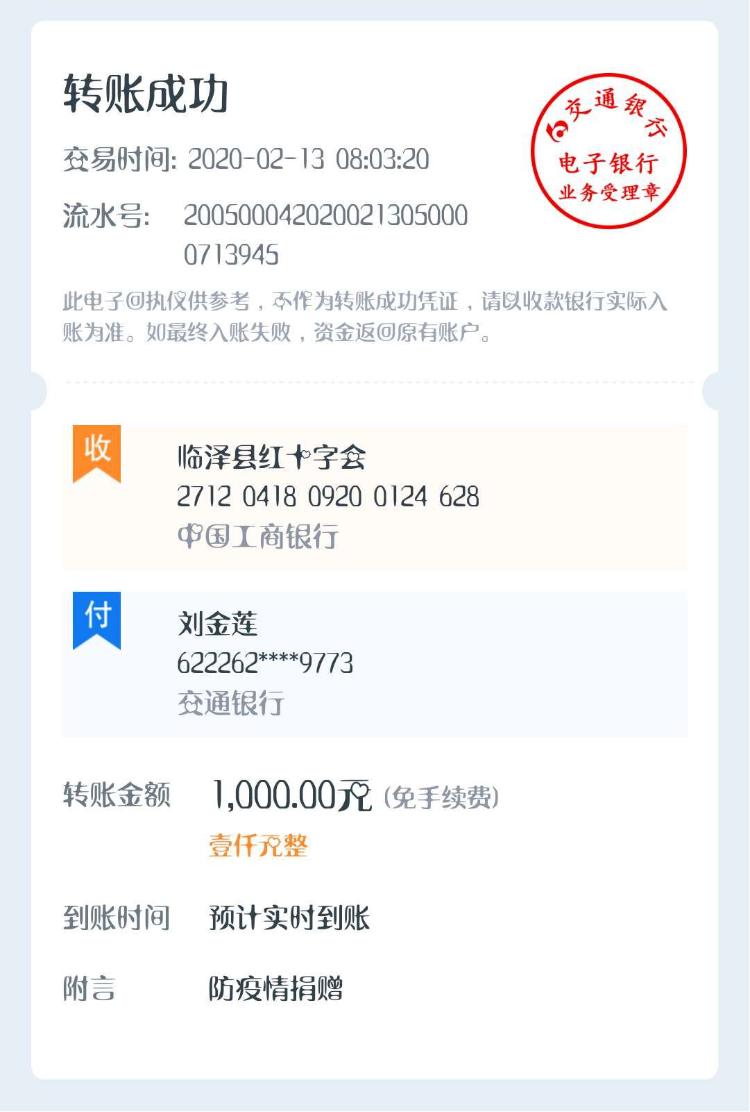 她就是寧夏辦事處職工劉金蓮同志。劉金蓮同志在工作中認真積極,是一名陽光樂觀、任勞任怨的優秀員工,她在平時生活工作中也總是積極主動的幫助他人。在這次疫情爆發后,2月13日,劉金蓮同志主動聯系當地甘肅省臨澤縣紅十字會,通過線上微信轉賬的方式,轉給紅十字會捐款人民幣1000元。接下來,她又主動聯系當地紅十字會工作人員,要求主動擔當志愿者,但是因為客觀原因,沒有被批準。