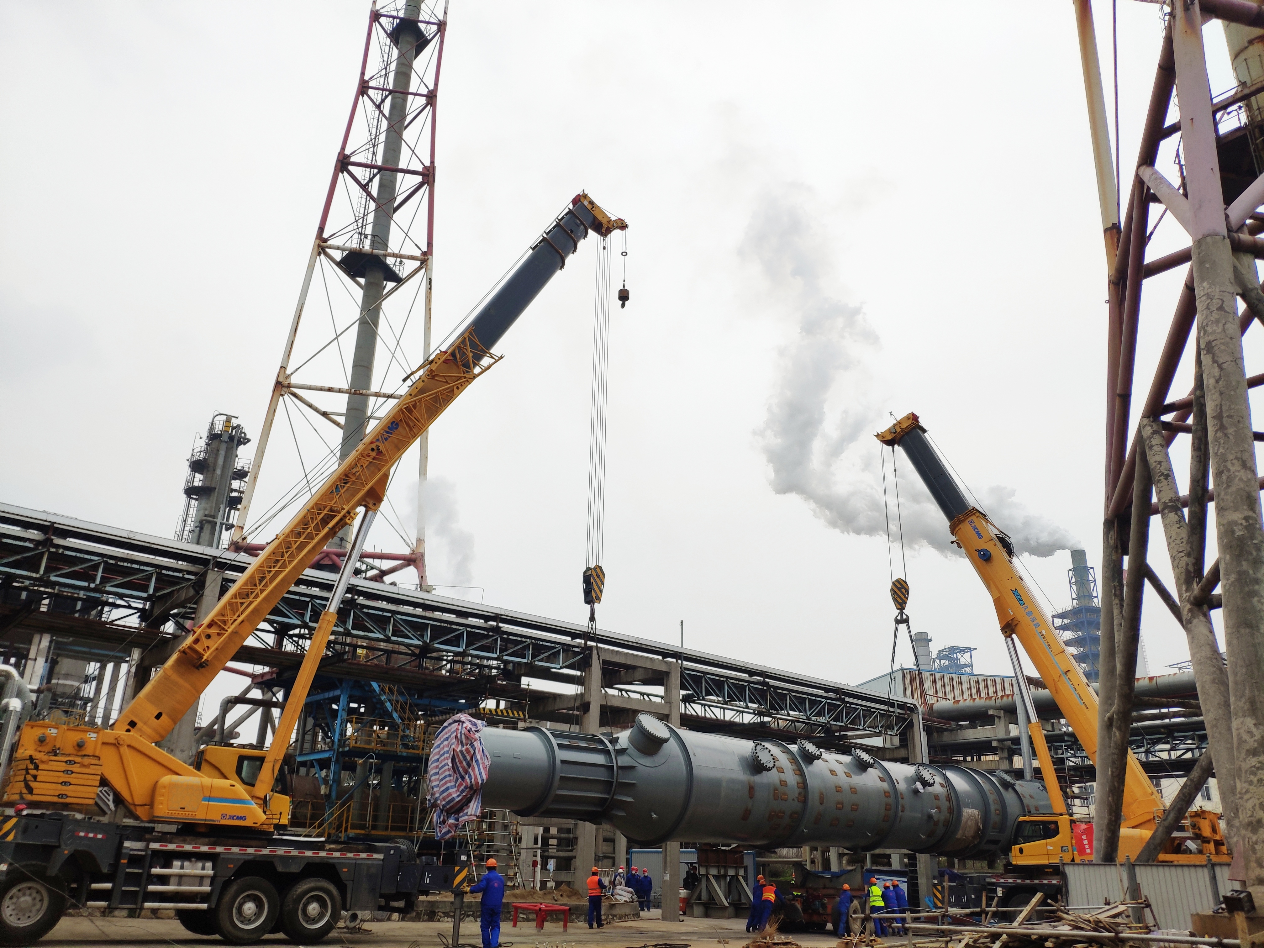 該脫硫塔設備分為上下兩段,僅下段設備就長達33米,重達58噸,體積十分龐大,但施工作業場地狹小、固有構筑物障礙多、吊重荷載大等諸多困難,造成設備無法一次性運至施工現場進行“穿衣戴帽”。面對艱巨任務,項目部多次優化倒運方案,提前合理部署,按照方案采用額定荷載分別為220噸和90噸的汽車吊實施雙機抬吊作業。