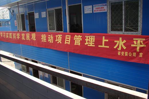 省政務服務中心及綜合樓和合肥中心醫院項目屬省、市重點工程之一。由多家大中型施工企業共同承建。我公司承擔的安裝工作量分別在1582萬和2800萬以上,是具有相當規模和社會影響的工程項目。合肥項目黨支部在開展第二批實踐科學發展觀活動中,因地制宜地開展宣傳活動。分別在這兩個項目施工現場懸掛了《深入開展學習實踐科學發展觀活動》和《學習實踐科學發展觀推動項目管理上水平》的橫幅標語。目前是整個施工現場開展學習實踐科學發展觀活動中唯一在現場宣傳的一家施工企業。