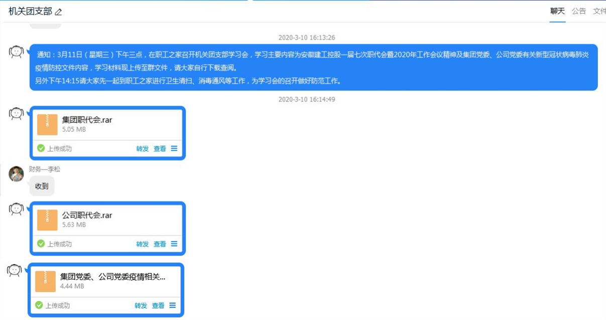 本次理論學習會為了縮短會議時間,采取集中學習與個人學習相結合的方式。會前已將學習材料分享至群文件,供大家自學查閱。會上全體團員集中學習了安徽建工控股一屆七次職代會精神、安徽安裝第十六屆七次職代會精神及《安徽安裝公司關于切實做好復工復產前疫情防控工作的通知》文件精神。