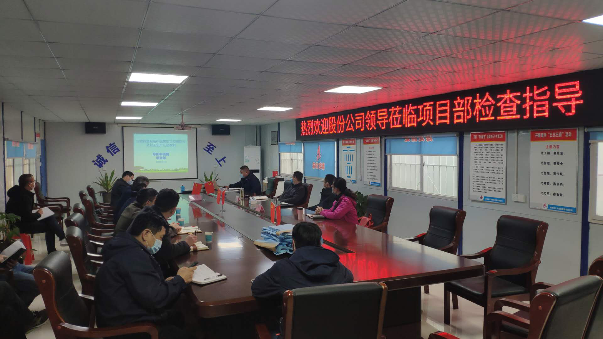 在聽取匯報(bào)后,黃代首先充分肯定了項(xiàng)目部在疫情防控、復(fù)工復(fù)產(chǎn)等方面所做的工作,強(qiáng)調(diào)在做好疫情防控工作的同時(shí),要全力實(shí)現(xiàn)達(dá)產(chǎn)超產(chǎn),并對(duì)項(xiàng)目部下一步防疫和生產(chǎn)工作提出要求:一是高度重視疫情防控工作,在安全復(fù)工的同時(shí)抓機(jī)遇搶產(chǎn)值,全力實(shí)現(xiàn)項(xiàng)目產(chǎn)值目標(biāo)任務(wù);二是持續(xù)強(qiáng)化黨建引領(lǐng)作用,發(fā)揮好黨員在項(xiàng)目建設(shè)和疫情防控工作中的先鋒模范帶頭作用,做到越是艱險(xiǎn)越向前,始終牢記宗旨,不忘初心,讓黨旗在防疫一線高高飄揚(yáng);三是要抓好生活區(qū)域衛(wèi)生防疫工作,定時(shí)消殺,食堂嚴(yán)格執(zhí)行分餐制,錯(cuò)時(shí)就餐,最大限度地減小人員聚集;四是切實(shí)做好復(fù)工返崗人員隔離觀察,做好復(fù)工人員的動(dòng)態(tài)管理工作,嚴(yán)格執(zhí)行集團(tuán)和屬地有關(guān)疫情防控規(guī)定,從源頭上防范疫情發(fā)生。