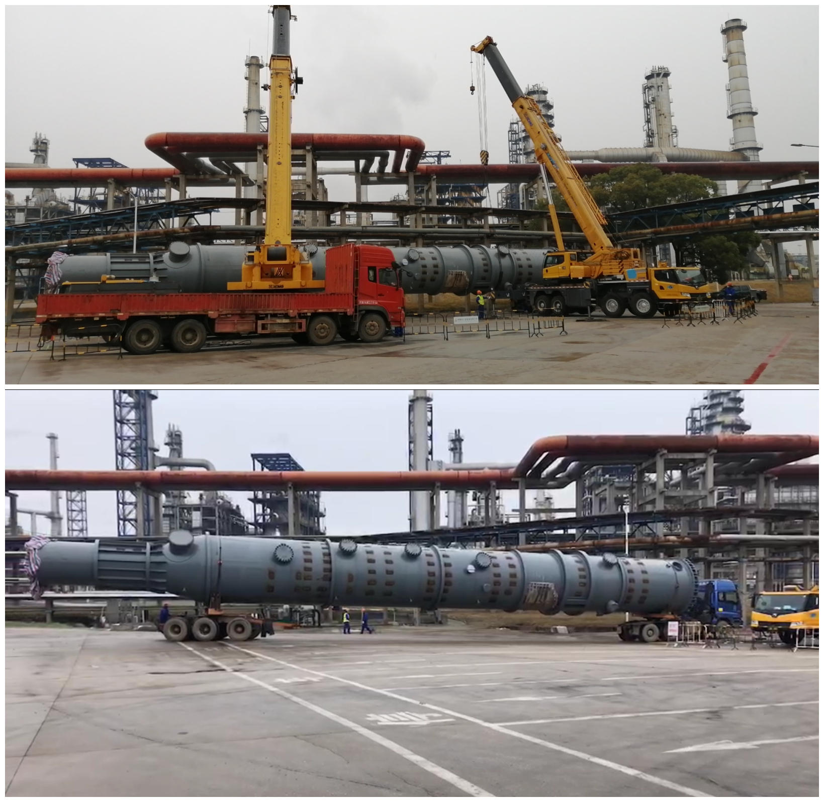 “Ⅰ、Ⅱ硫磺回收裝置增設煙氣后堿洗流程項目”是能使煙氣SO2排放濃度從原先的50mg/m3下降至≤10mg/m3的環保工程。但該項工程僅一個脫硫塔下段就高達33米,重達58噸,體積十分龐大,而現場存在作業場地狹小,固有障礙物多、吊重荷載大等諸多問題,無法將設備一次性運至施工現場并進行下段焊接梯子、平臺等附塔“穿衣戴帽”作業。對此,項目部多次優化倒運方案,提前合理部署,采用額定荷載分別為220噸和90噸的汽車吊實施雙機抬吊作業和專為公路橋梁設計使用的炮車運輸,從而順利完成了倒運工作。同時,為爭取時間,安排班組實行夜間倒班制,管理人員輪班制,為接下來的脫硫塔“穿衣戴帽”和上下段空中組對焊接作業爭取了寶貴時間。