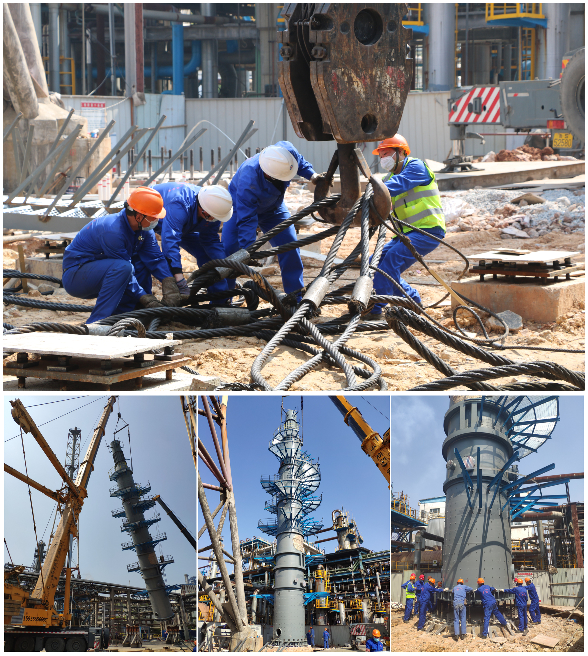 11時35分,在做好充分準備后,激動人心的時刻終于到來。隨著起重負責人一聲哨響,兩臺吊車一齊發(fā)力,吊裝工作有條不紊地展開。一陣轟鳴聲中,脫硫塔下段緩緩抬起,在兩臺吊車的默契配合下一點點升高直至完全吊離鞍座,在空中豎立,穩(wěn)步移向脫硫塔基礎上方,對準螺栓慢慢落下,工人們立即前去緊固,整個過程分公司領導班子、業(yè)主單位負責人、監(jiān)理全部在現(xiàn)場“督戰(zhàn)”。最終,在各方力量的通力配合下,經(jīng)過三個多小時的奮戰(zhàn),脫硫塔下段一次性就位成功,吊裝作業(yè)圓滿結束。
