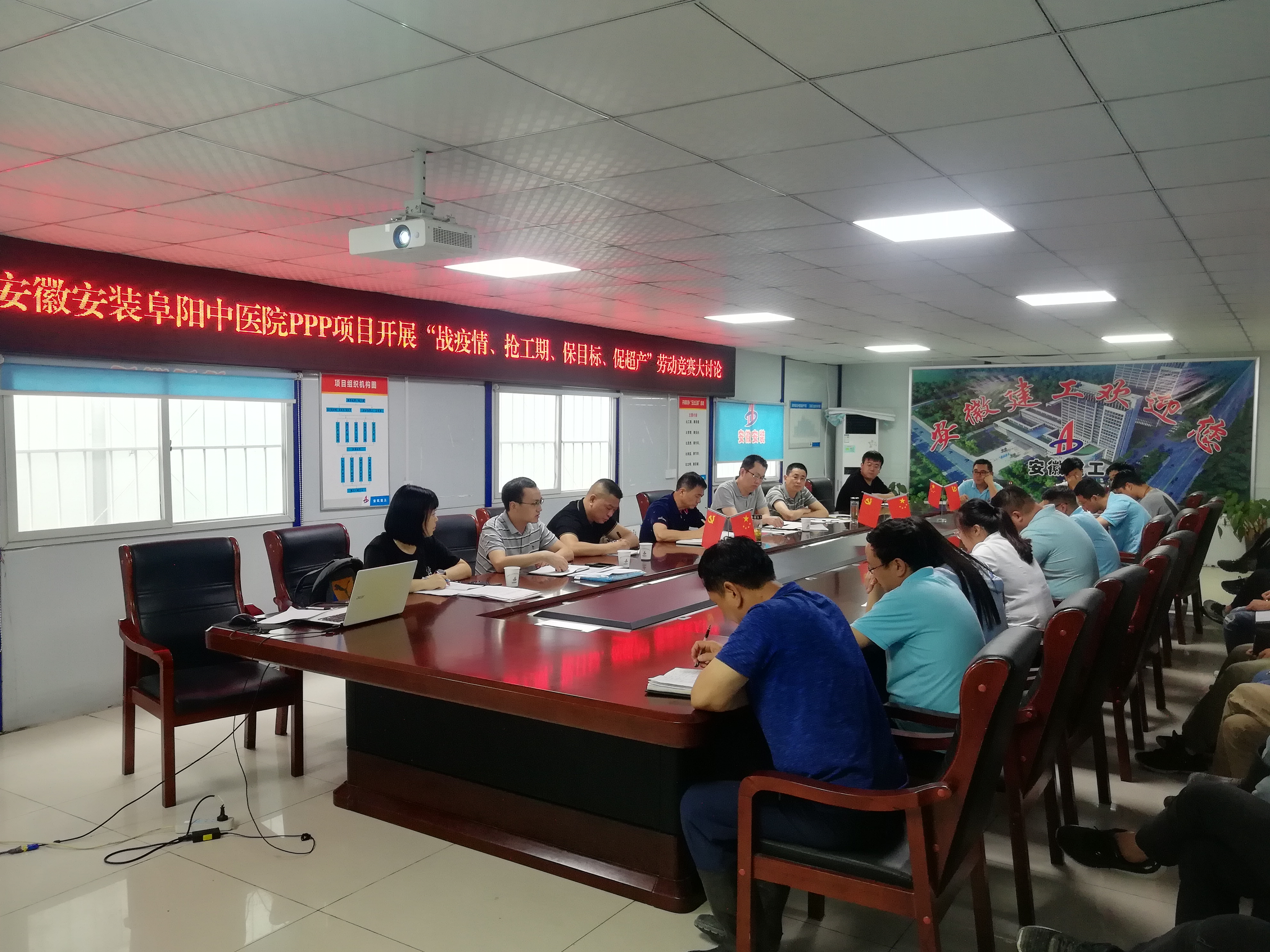 為認真貫徹公司“戰疫情、搶工期、保目標、促超產”勞動競賽活動精神,7月12日下午,公司紀委書記、工會主席李寬旭,副總經理王軍一行在阜陽潁東中醫院建設PPP項目部會議室,組織開展“戰疫情、搶工期、保目標、促超產”勞動競賽大討論,分公司領導班子成員、項目部全體人員30余人參加了會議,會議由李寬旭主持。