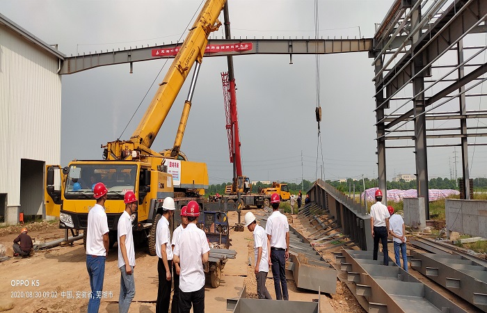 伴隨著現(xiàn)場人員緊張而又激動的心情,第一拼40米大跨度的重型橫梁徐徐升起,并精準(zhǔn)吊裝就位,這意味著經(jīng)過100多天的奮戰(zhàn)后,蕪湖項(xiàng)目鋼結(jié)構(gòu)工程跨越了施工難度節(jié)點(diǎn)和取得了階段性突破,同時標(biāo)志著該項(xiàng)目鋼結(jié)構(gòu)工程最后的主體完工已邁出至關(guān)重要的一步。
