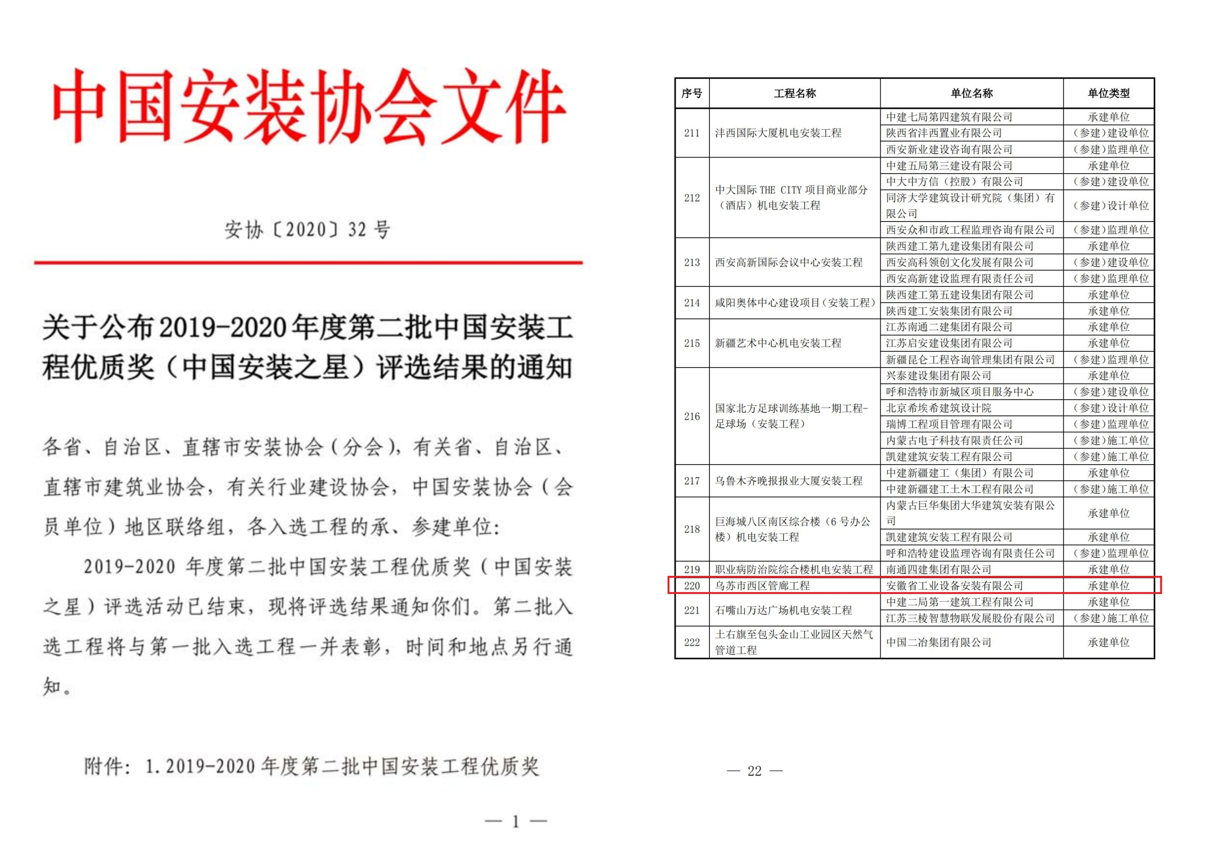 12月10日,經(jīng)中國(guó)安裝協(xié)會(huì)評(píng)選,由安徽安裝公司承建的新疆烏蘇市西區(qū)管廊工程成功獲得中國(guó)安裝工程優(yōu)質(zhì)獎(jiǎng) (中國(guó)安裝之星),這也是我公司首獲的工業(yè)設(shè)備安裝類中國(guó)安裝工程優(yōu)質(zhì)獎(jiǎng)。