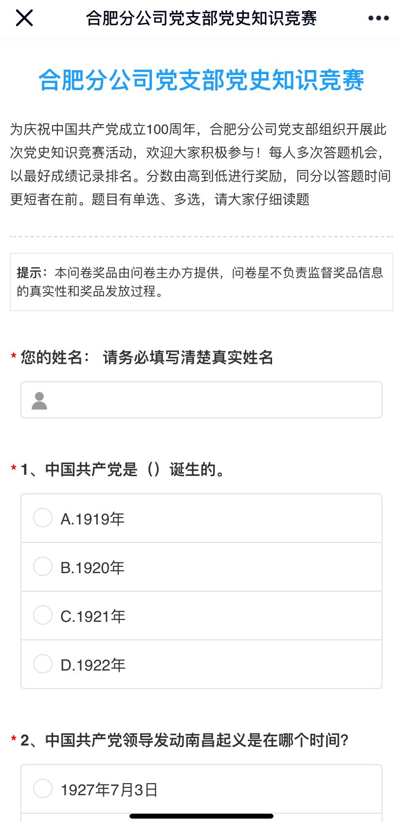 本次知識(shí)競(jìng)賽活動(dòng)以網(wǎng)絡(luò)答題形式開(kāi)展,通過(guò)個(gè)人答題,后臺(tái)計(jì)分的方式進(jìn)行,參賽人員點(diǎn)擊鏈接進(jìn)入答題界面,題目分為單選題和多選題,內(nèi)容涵蓋了黨的基本理論、基本路線、綱領(lǐng)以及黨章知識(shí)等內(nèi)容,分公司全體黨員、入黨積極分子、青年團(tuán)員積極踴躍的參加答題。