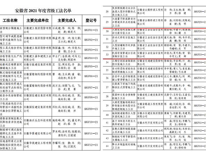 近日,安徽省住房和城鄉建設廳第22號公告公布2021年度安徽省省級工法名單,安徽省工業設備安裝有限公司的《大跨度結構滾軸式滑動支座安裝工法》、《活動式橋架安裝施工工法》、《大型儲罐制作同步提升施工工法》和《機房密集管道分區塊預制安裝工法》榜上有名。