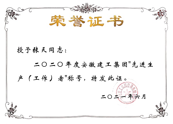2017年5月,張?zhí)焱靖鶕?jù)工作需要遠(yuǎn)赴新疆烏蘇項(xiàng)目上,在不到兩年的時(shí)間內(nèi),嚴(yán)謹(jǐn)求實(shí),勤奮刻苦,兢兢業(yè)業(yè),時(shí)時(shí)處處嚴(yán)格要求自己,始終以飽滿的工作熱情、扎實(shí)的工作作風(fēng)、優(yōu)異的工作成績(jī),贏得了廣大員工的普遍好評(píng),榮獲2020年“建工集團(tuán)年度先進(jìn)生產(chǎn)(工作)者”稱號(hào)。