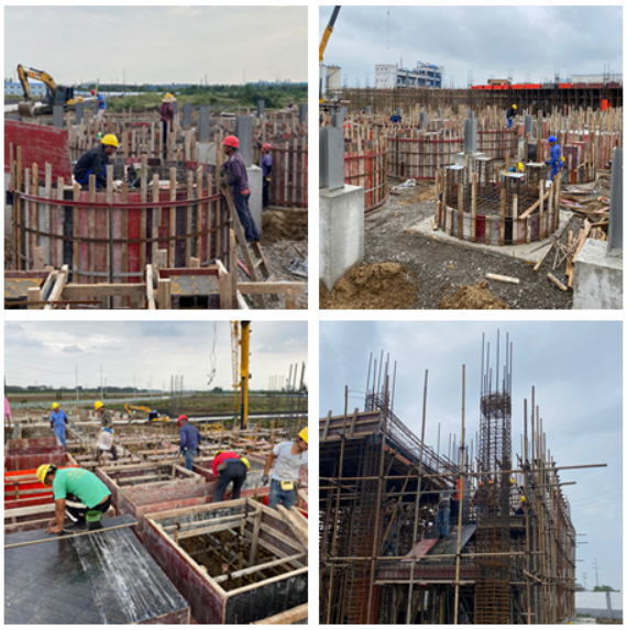 新宇藥業微生物藥物生產建設項目一期工程 罐體基礎設施;發酵車間一層頂腳手架搭設、模板安裝;動力車間鋼筋綁扎