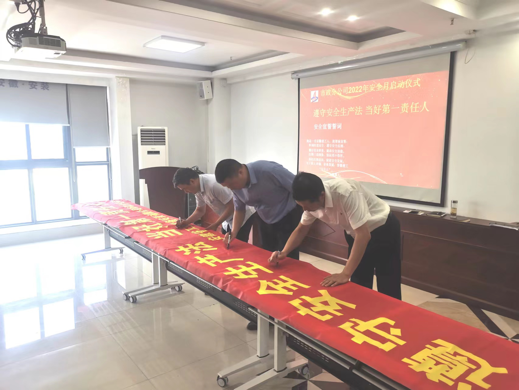 會(huì)議開始前首先舉行了市政分公司2022年安全月啟動(dòng)儀式,分公司副經(jīng)理黃彥濤宣讀了第一責(zé)任人倡議書,作了分公司安全生產(chǎn)月動(dòng)員講話,與會(huì)人員集體安全宣誓,并在安全月主題條幅上簽名。