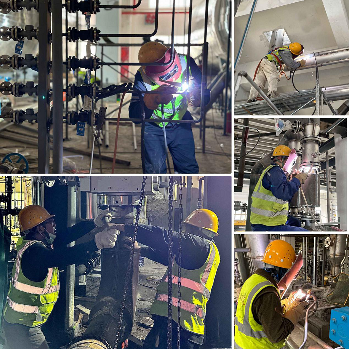 面對建設單位準備在5月下旬進行試生產的目標任務,車間內新增管線是否能夠按時完成就成為確保試生產順利進行的最大難題。為此,項目部精心組織、加強協(xié)調,認真部署,通過多次召開碰頭會最終達成最優(yōu)施工進度方案,做到明確每日進度內容,合理安排施工人員,積極做好施工現(xiàn)場各項安全防護工作,在保證原有工程量的基礎上,對新增管線進行科學分解,新增突擊作業(yè)隊,采用“5+2”“白加黑”,多個小組多工作面同時施工的方法,開足馬力快速推進,從而大大提高了施工速度,提升了工作效率。