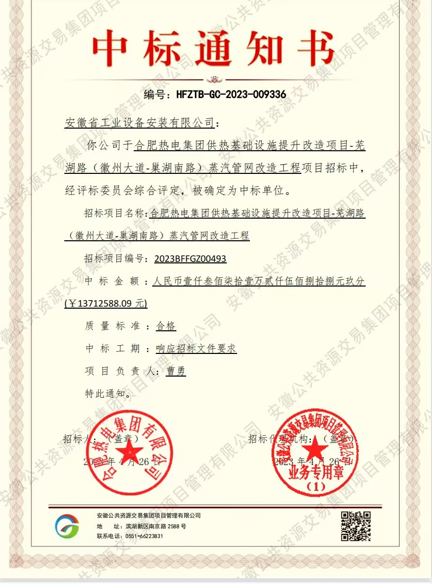 近日,安徽安裝市政分公司收到安徽公共資源交易平臺發(fā)來的中標通知書,成功中標合肥熱電集團供熱基礎(chǔ)設(shè)施提升改造項目-蕪湖路(徽州大道-巢湖南路)蒸汽管網(wǎng)改造工程,中標金額1371.25萬元。