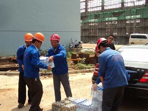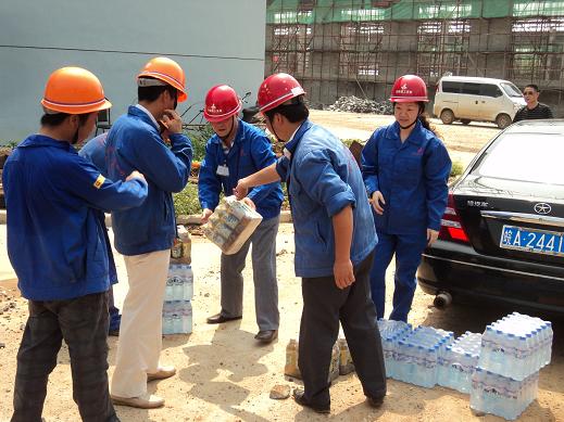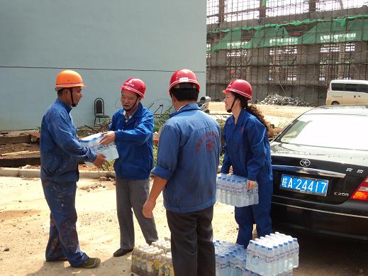 7月28日,氣溫高達36度,酷暑難耐,分公司書記、經理李貴林,副經理史崇松、方斌、劉紅艷一行深入一線工地,慰問戰斗在一線的生產、管理人員。每到一處,李貴林同志都會關切的詢問防暑和安全情況,并將一箱箱礦泉水送到一線人員的手中,使他們在夏日里感受到了一縷清爽的涼風。