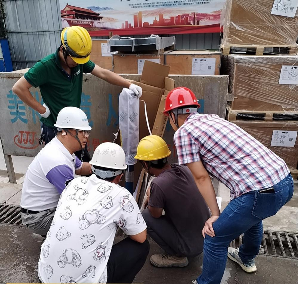 安徽大學(xué)綠色產(chǎn)業(yè)創(chuàng)新基地項目現(xiàn)場安裝人員正在進行電梯開箱檢驗