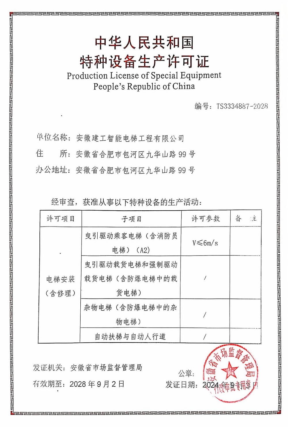 近日,經(jīng)安徽省市場監(jiān)督管理局核準,安徽建工智能電梯工程有限公司順利取得特種設(shè)備生產(chǎn)許可證,喜獲電梯安裝(含修理)A2級資質(zhì)。