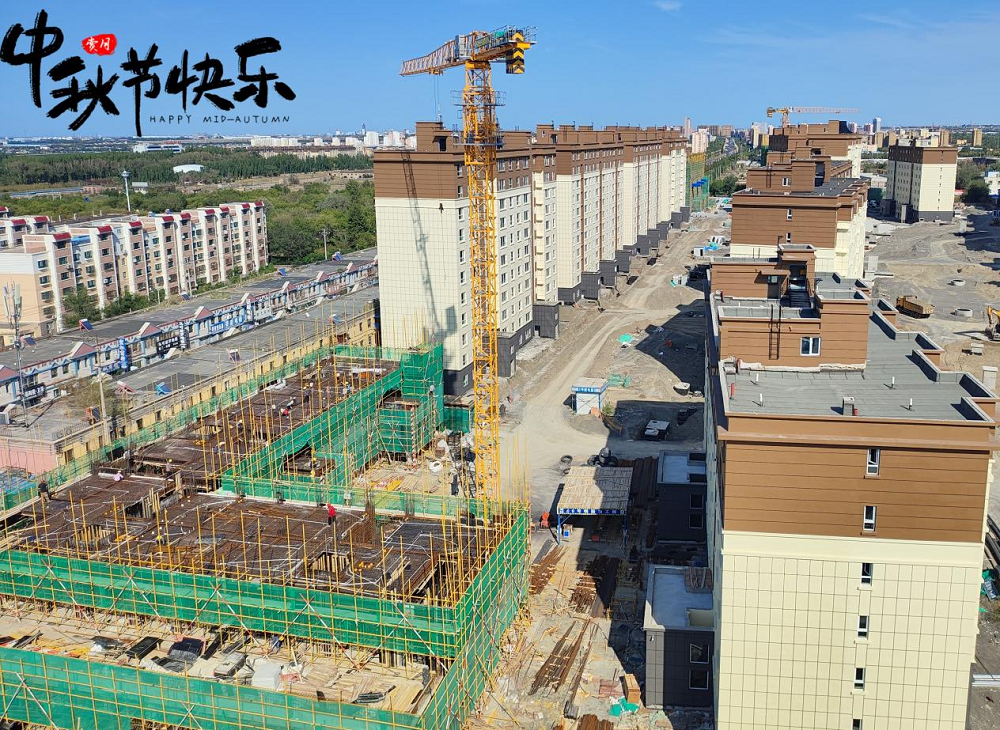 中秋佳節如期至,良辰施工奮斗時。在新疆烏蘇,南苑新城小區住宅樓建設項目施工現場樓宇林立、錯落有致,項目室外管網及室外配電設施全面進行施工,新開樓棟已完成4棟樓主體結構封頂,現為在冬休期來臨之前實現 22 棟樓竣工驗收,完善室外供電、供暖、給排水、消防等基礎設施,以及完成新開樓棟主體結構驗收的目標而不懈奮斗。項目全體員工以跑步前進、只爭朝夕的昂揚姿態,全力保障項目施工建設高效推進。