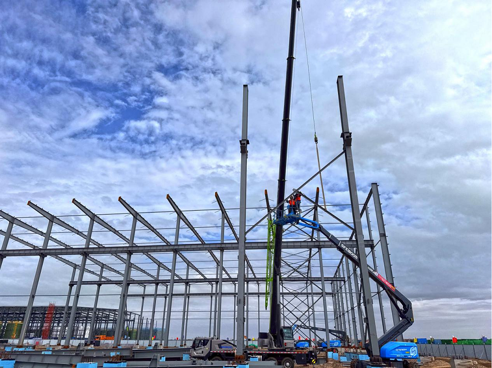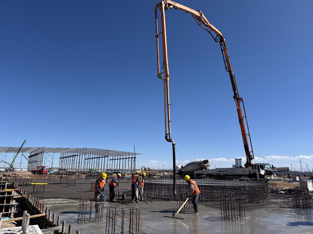 截至目前,廠房鋼結構完成1500噸建設量,獨立基礎、條形基礎全部完成,設備基礎正在施工;變電所二層主體施工完成,三層主體正在施工。