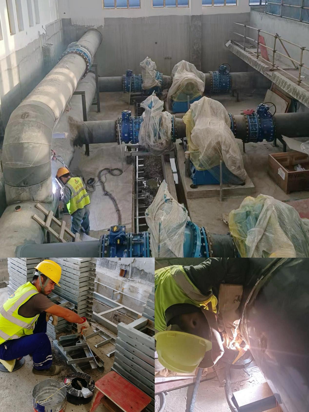 圖為合肥七水廠三期電安裝項目電纜溝支架刷漆、碳濾池管廊水沖管焊接