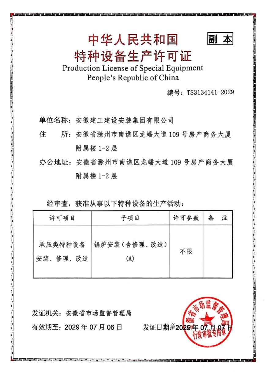 此次鍋爐特種設備許可A級證書取得將為公司承接各類工業(yè)、民用項目的開發(fā)奠定良好的基礎。