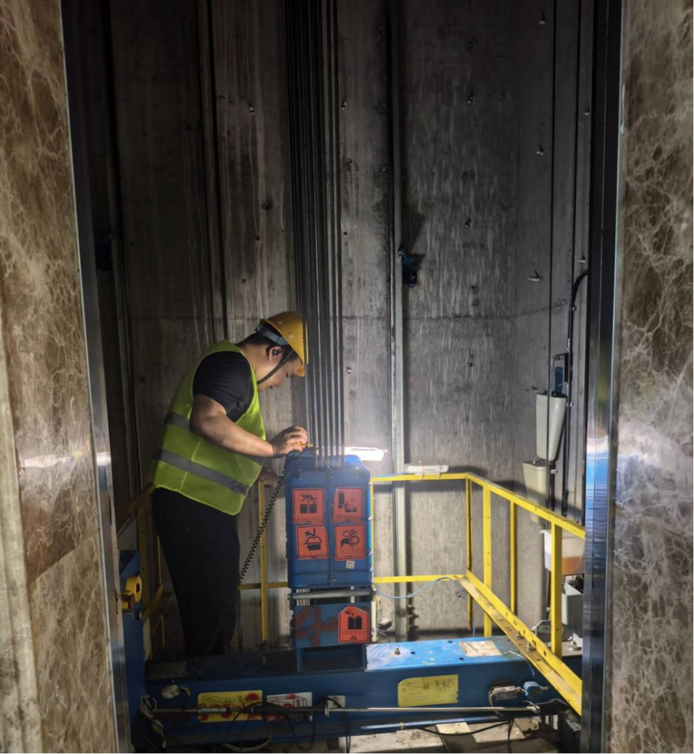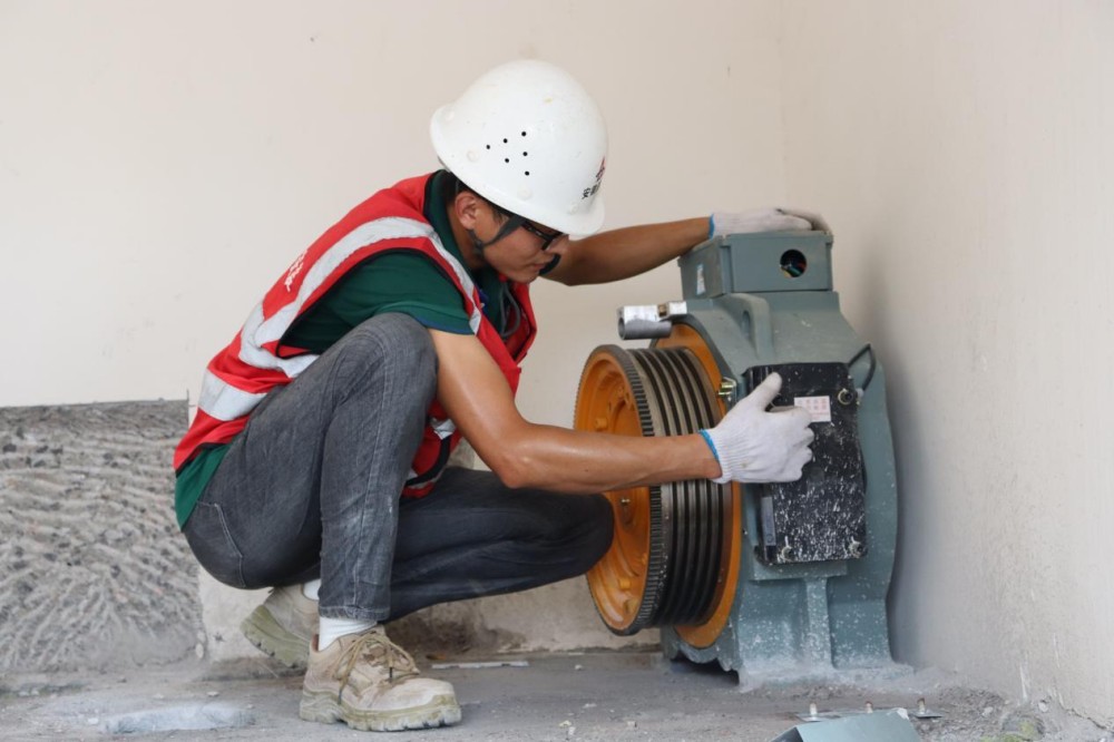 桃花科創(chuàng)產(chǎn)業(yè)園EPC項目施工人員正在調(diào)試電梯主機平衡度