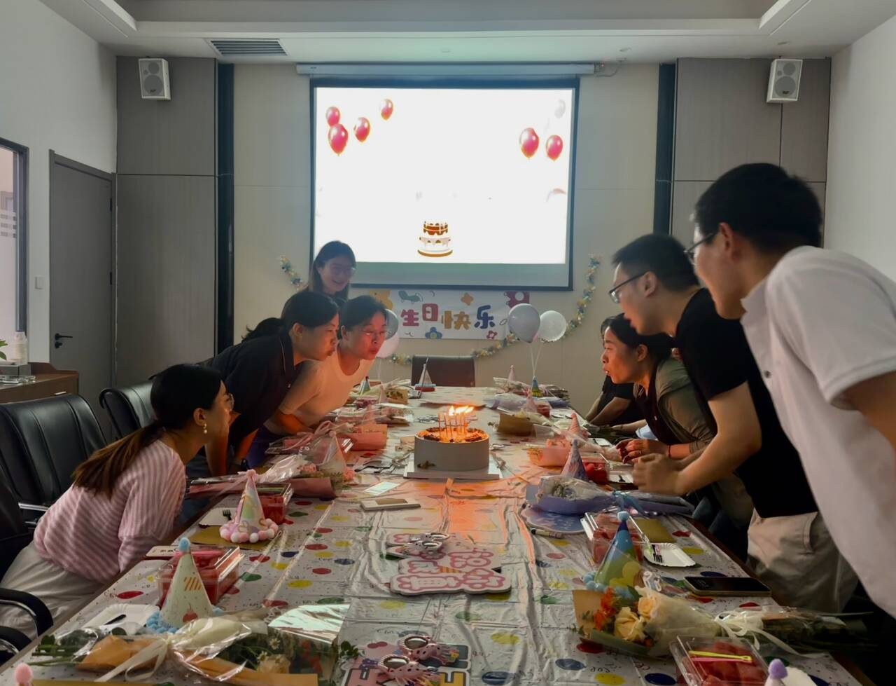 下午5點,隨著三季度“壽星”們笑容滿面地陸續來到會議室,生日會的溫馨序曲正式奏響——工會工作人員為每位到場的“壽星”遞上印有手寫祝福的生日賀卡,隨著“祝你生日快樂···”音樂響起,大家圍在一起吹蠟燭、吃蛋糕、送生日祝福,現場氣氛熱烈,充滿了歡聲笑語。